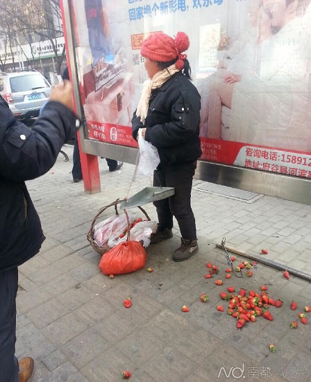 據(jù)網(wǎng)友“老?!辟N圖在朋友圈講述,1月25日,他在街上看到,一位戴紅頭巾的農(nóng)婦把兩籮筐草莓放在公交站臺背后。隨后,從府谷縣城管車上跳下一灰色西裝男子和一短發(fā)女子,均未穿制服。該女子提起農(nóng)婦的一籮筐草莓就上了車,留下西裝男“善后”?!稗r(nóng)婦顧不得撒在地上的草莓,去車窗前討要,誰知執(zhí)法車竟加速開走”。網(wǎng)友“老?!狈Q。此事在網(wǎng)上很快發(fā)酵,@任志強也在微博作了轉(zhuǎn)發(fā),并質(zhì)問“直接搶?”