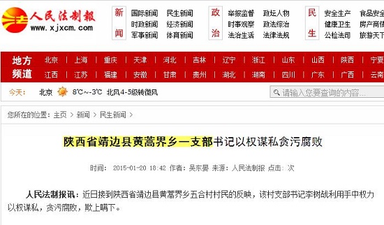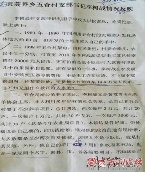 接到陜西省靖邊縣黃蒿界鄉(xiāng)五合村村民的反映,該村支部書(shū)記李樹(shù)戰(zhàn)利用手中權(quán)力以權(quán)謀私,貪污腐敗,欺上瞞下。