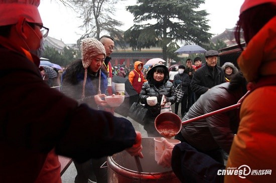 西安大興善寺每年臘月初八,寺內(nèi)都會(huì)施粥,大家認(rèn)為吃了可以得到佛陀保佑,所以稱它“佛粥”。寺內(nèi)的僧執(zhí)說,每年都有許多人專門奔“粥”而來。