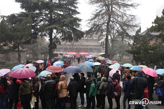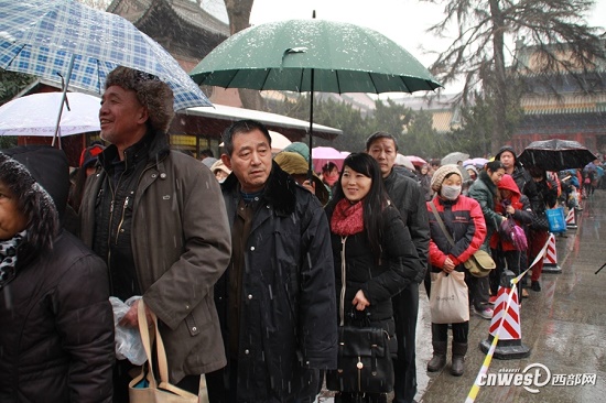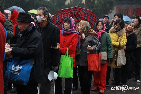 在風(fēng)雪中等待領(lǐng)粥的善男信女們。
