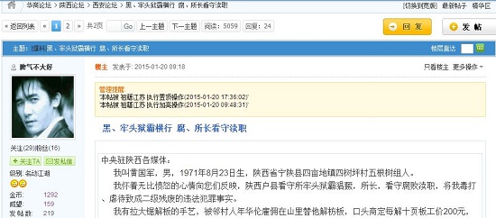 原因是戶縣看守所時(shí)任所長王滿利,看守員王一文嚴(yán)重腐敗瀆職,他們放縱牢頭獄霸石某橫行。石某在社會(huì)上本是打打殺殺的人渣,因傷人入監(jiān),又因?yàn)槠涓负涂词貑T王一文是戰(zhàn)友,馬上成為稱霸一室的獄霸。他先是強(qiáng)令我向家里人捎信要錢,因我家境貧寒入獄時(shí)還未取妻,家中只有患多種慢性病的年邁老母,盡管四處求告,還是未借下錢,難以孝敬獄霸石某。從此我的惡運(yùn)就來了,石某不但對(duì)我拳腳相加,打的我口吐鮮血,遍體鱗傷,還不給我吃飯,晚上不準(zhǔn)我睡覺,用電影里才能看到的軍統(tǒng)特務(wù)折磨共產(chǎn)黨人的殘酷手段折磨我。更為可惡的是寒冬臘月,他將我衣服全部扒光,讓我站在房子外邊的空地上,用事先準(zhǔn)備好的十幾臉盆涼水從我頭上澆下,我多次被他折磨的當(dāng)場昏厥,大小便失禁。時(shí)間從2003年冬11月折磨毒打我到2004年4月,我已近雙目失明,爬在地上已不能走動(dòng)時(shí),我才被調(diào)換了號(hào)子撿得了一條性命。
