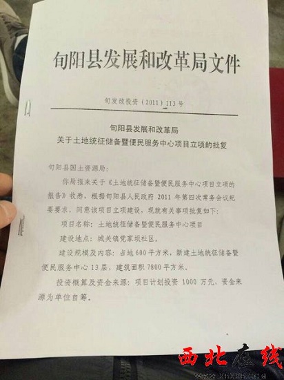 資料中有旬陽縣發(fā)展和改革局文件:“土地統(tǒng)征儲(chǔ)備即便民服務(wù)中心13層,面積7800平方米,項(xiàng)目計(jì)劃投資1000萬元,資金來源為單位自籌。建設(shè)工期2011年9月開工,2012年9月竣工?!?