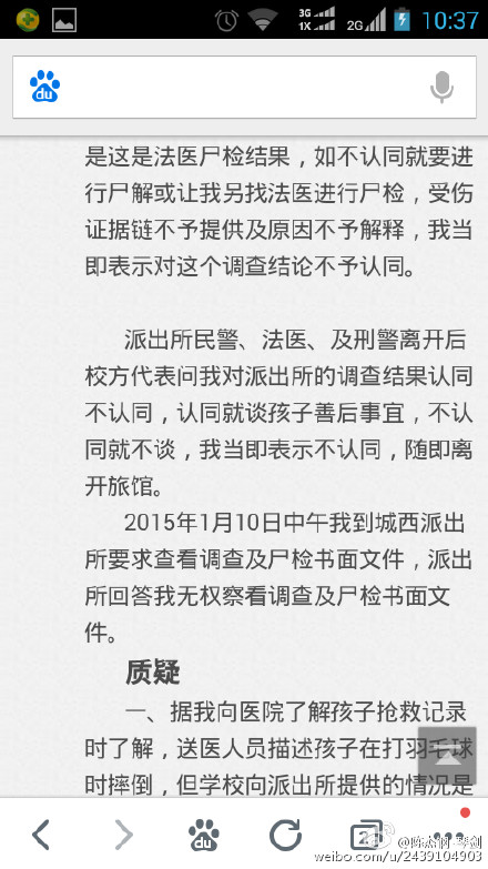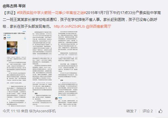 據(jù)新浪微博爆料:【求證】#陜西實驗中學火箭班一花季少年離世之謎#2015年1月7日下午約17點33分戶縣實驗中學高二一班王某某家長接學校電話通知,孩子在學校摔倒不省人事。家長趕到醫(yī)院,孩子已沒有心跳呼吸,家長在孩子頭部發(fā)現(xiàn)有傷。http://t.cn/RZSdRJb @陜西省教育廳