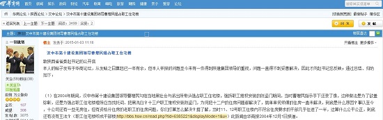 本人的帖子發(fā)布于華商論壇,從發(fā)帖之日算起已一年有余,但本人舉報的問題至今未有一件得到陜建集團(tuán)領(lǐng)導(dǎo)的重視,問題一直得不到妥善解決,因此才向趙書記您反映;通過總結(jié)、歸納如下: (1)在2004年期間,漢中市第十建設(shè)集團(tuán)領(lǐng)導(dǎo)曹增民勾結(jié)當(dāng)?shù)睾谏鐣c派出所帶頭強占職工住宅樓,強拆職工維權(quán)安裝的防盜門期間,當(dāng)時曹增民指示手下還錄了像,這種做法是為了欲蓋彌彰,還是為強占職工住宅樓理所應(yīng)當(dāng)找托詞、把黑洗白?十三戶職工維權(quán)安裝防盜門,為何把十二戶的住房問題都解決了,就單單何師傅的住房一直未解決,到底是什么原因?事以至今,十公司還有一些無房住,但有資格分住房的老職工的住房問題,你們打算怎么解決?據(jù)了解,當(dāng)時11、12號職工住樓內(nèi)不符合住房要求的干部幾乎住進(jìn)了一半,這算什么公平公正,到底還有沒有王法?(職工住宅樓咋成干部樓 http://bbs.hsw.cn/read.php?tid=6385221&displayMode=1&u= )