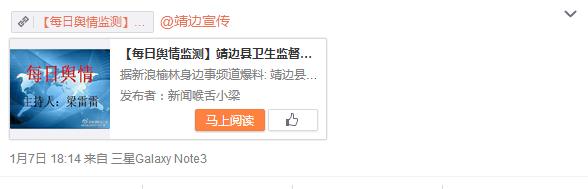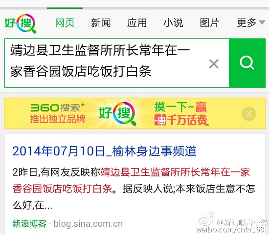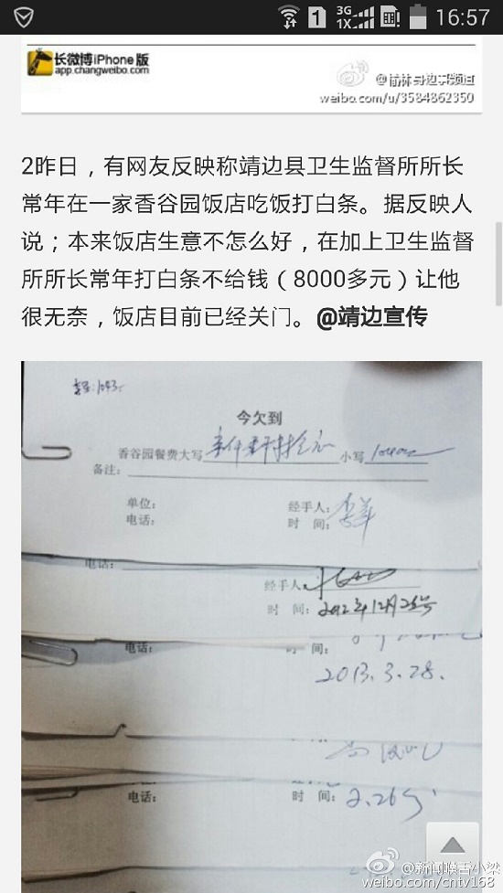據(jù)新浪微博爆料:【靖邊縣衛(wèi)生監(jiān)督所所長常年在一家香谷園飯店吃飯打白條】有網(wǎng)友反映稱靖邊縣衛(wèi)生監(jiān)督所所長常年在一家香谷園飯店吃飯打白條。據(jù)反映人說;本來飯店生意不怎么好,在加上衛(wèi)生監(jiān)督所所長常年打白條不給錢(8000多元)讓他很無奈,飯店目前已經(jīng)關門。