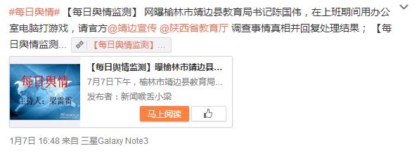 據(jù)新浪微博爆料:7月7日下午,榆林市靖邊縣教育局書記陳國偉,在上班期間用辦公室電腦打游戲,試問黨的群眾路線教育怎么實(shí)施的?請官方調(diào)查事情真相并回復(fù)處理結(jié)果;@靖邊宣傳@陜西省教育廳