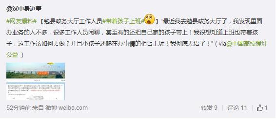 #網(wǎng)友爆料#【勉縣政務大廳工作人員#帶著孩子上班#[吃驚]】“最近我去勉縣政務大廳了,我發(fā)現(xiàn)里面辦業(yè)務的人不多,很多工作人員閑聊,甚至有的還把自己家的孩子帶上!我很想知道上班也帶著孩子,這工作該如何去做?并且小孩子還爬在辦事情的柜臺上玩!我徹底無語了!”