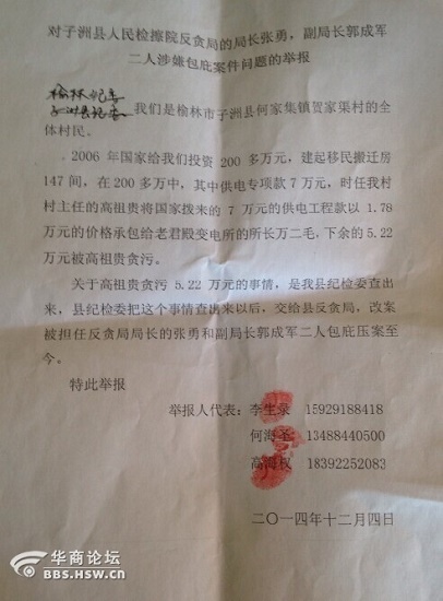 關(guān)于高祖貴貪污5.22萬元的事情,是子洲縣紀(jì)委查處來,該縣紀(jì)委把這個事情查出來以后,交給縣反貪局,該案被擔(dān)任子洲縣反貪局局長的張勇和副局長郭成軍二人包庇壓案至今。
