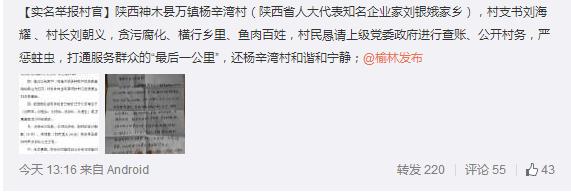 【實(shí)名舉報(bào)村官】陜西神木縣萬(wàn)鎮(zhèn)楊辛灣村(陜西省人大代表知名企業(yè)家劉銀娥家鄉(xiāng)),村支書(shū)劉海耀、村長(zhǎng)劉朝義,貪污腐化、橫行鄉(xiāng)里、魚(yú)肉百姓,村民懇請(qǐng)上級(jí)黨委政府進(jìn)行查賬、公開(kāi)村務(wù),嚴(yán)懲蛀蟲(chóng),打通服務(wù)群眾的“最后一公里”,還楊辛灣村和諧和寧?kù)o。