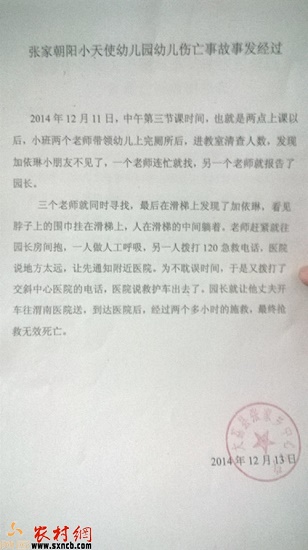 接到家長(zhǎng)的反映后,記者于12月24日來到下寨鎮(zhèn)張家朝陽(yáng)村,一位知情人透漏:事情發(fā)生在12月11日。三歲女童加某在課間玩滑滑梯時(shí),被圍脖掛在滑滑梯上,人身體還往下滑,長(zhǎng)時(shí)間無人監(jiān)護(hù)、發(fā)現(xiàn),活活把娃給勒死了……,你說這老師和和幼兒園是咋回事,真叫人心疼,唉!……