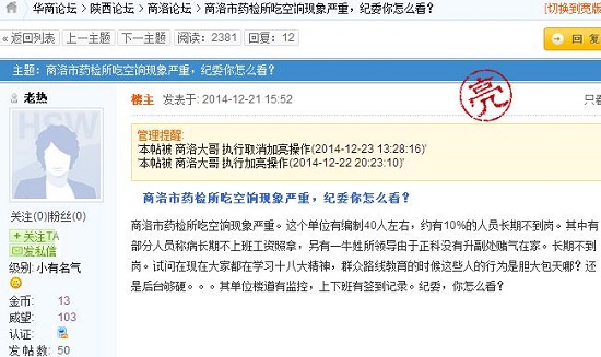 商洛市藥檢所吃空餉現(xiàn)象嚴(yán)重。這個單位有編制40人左右,約有10%的人員長期不到崗。其中有部分人員稱病長期不上班工資照拿,另有一牛姓所領(lǐng)導(dǎo)由于正科沒有升副處賭氣在家。長期不到崗。試問在現(xiàn)在大家都在學(xué)習(xí)十八大精神,群眾路線教育的時候這些人的行為是膽大包天哪?還是后臺夠硬。。。其單位樓道有監(jiān)控,上下班有簽到記錄。紀(jì)委,你怎么看?