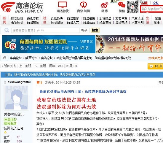 5.由于劉風(fēng)鑫2013.7.11號親筆協(xié)議所承諾,“以上協(xié)議如果甲方不按時執(zhí)行,乙方有權(quán)干預(yù)?!逼湫聵欠恳宦凤j升,至到出租,出售( 除了一二層劉做為門面房出租其余全部售完)新來的住戶給本來就窄小的公用通道帶來物業(yè) 、采光、遮蔭、消防、防洪等隱患,找到劉夫婦時,劉夫婦一個口徑,“補(bǔ)償遮蔭可以,但給錢了,你不許再告我?!辈ξ胰鐚嵎从炒耸鹿⒐⒂趹眩羰蛊浒軇鴱?qiáng)(農(nóng)民,看場人)拿著2.5米的鋼管揚言“打死你這個老雜種!”(現(xiàn)鋼管存放于商南縣派出所110指揮部)現(xiàn)經(jīng)縣國土局,法院調(diào)解,又提出補(bǔ)償遮陰費可以,但讓我允諾讓其在違法建筑上再加蓋二層,尊敬的領(lǐng)導(dǎo)們,正義的記者們,請你們想一想,評論一下,這是一個什么品質(zhì)的人,究竟是國大還是權(quán)大,是法律尊嚴(yán),還是由于此人由于享受副縣級待遇,商南縣委、政府、人大就管不了?還是那句話。在省.6月份巡視商南工作期間,我為了顧全商南政府影響,未將劉的這些行徑向省.反映,成了劉諷刺我的話柄,縣紀(jì)委書記崔偉峰接到舉報,曾責(zé)令縣國土局組織調(diào)查,國土局以(2014)151號文件曾上報紀(jì)委,不知何故,一直無果,難道沒有天理了?沒有國法了嗎?