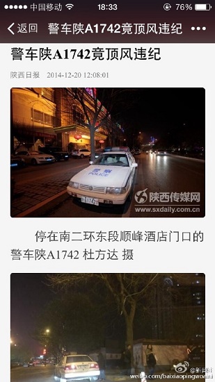 【警車陜A1742竟頂風(fēng)違紀(jì)】2014年12月19日晚19時(shí)15分,一輛車牌號(hào)為陜A1742的警車駛進(jìn)西安南二環(huán)東段較豪華的順?lè)寰频觊T前,車停穩(wěn)后,下車的男男女女一起走進(jìn)順?lè)寰频甏箝T。隨后,這輛警車逆行停放在順?lè)寰频甏箝T前道路規(guī)定禁停的車道上,隨后駕駛員也走進(jìn)了這家酒店。
