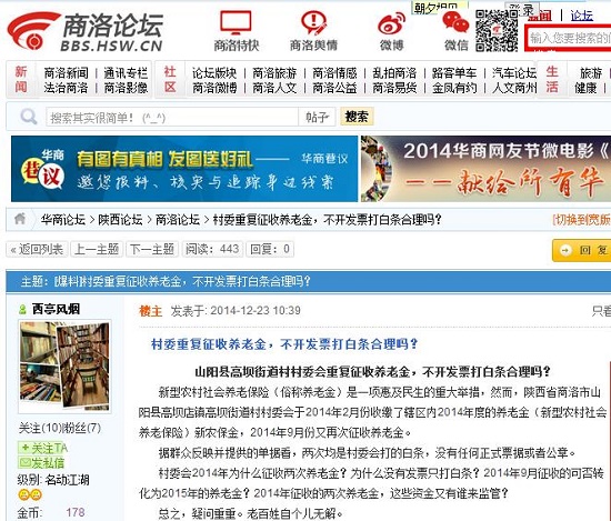 新型農(nóng)村社會(huì)養(yǎng)老保險(xiǎn)(俗稱養(yǎng)老金)是一項(xiàng)惠及民生的重大舉措,然而,陜西省商洛市山陽縣高壩店鎮(zhèn)高壩街道村村委會(huì)于2014年2月份收繳了轄區(qū)內(nèi)2014年度的養(yǎng)老金(新型農(nóng)村社會(huì)養(yǎng)老保險(xiǎn))新農(nóng)保金,2014年9月份又再次征收養(yǎng)老金。