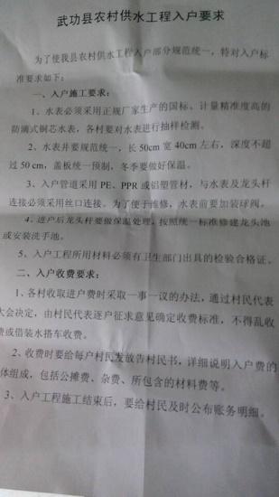 武功縣水利局李姓工作人員隨后出示一份該局發(fā)給各鄉(xiāng)鎮(zhèn)的書面通知中明確規(guī)定:一事一議籌資由村民代表逐戶征求意見確定收費(fèi)標(biāo)準(zhǔn),不得亂收費(fèi)……,收費(fèi)要給每戶村民發(fā)放告知村民書,詳細(xì)說明入戶費(fèi)的具體組成……,要給村民及時(shí)公布賬務(wù)明細(xì)。