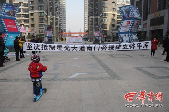昨日,多位融僑馨苑業(yè)主向華商報反映,小區(qū)里要新建立體停車庫,選了兩個地方,附近業(yè)主不愿意,拉著橫幅抗議。