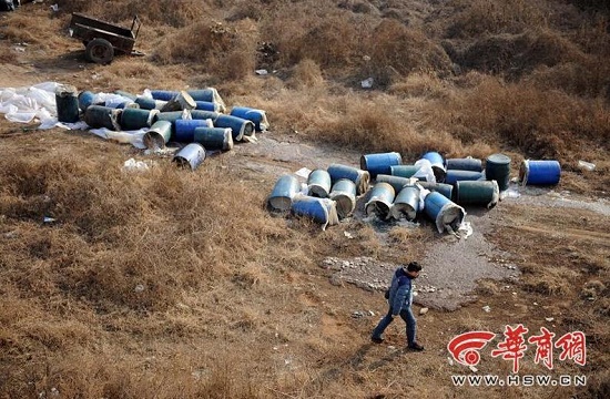 昨日早晨,家住藍田縣白羊寨村的胡女士,一打開自家窗戶就被眼前的景象嚇了一跳:樓下一片空地,突然冒出許多藍色塑料桶,似乎還有液體流出?!斑h遠地就能聞到一股酸味,嚇得我趕緊把窗戶關上了?!弊蛉丈衔?0時許,在白羊寨村一處空地上,散落著百余只藍色塑料桶?!?7號晚上10時許,我睡得迷迷糊糊的,聽到有大貨車卸貨的聲音?!备浇姾干虘艄と送鯉煾嫡f。還有商戶說,早上開門時,看到塑料桶散落在地上,因為味道太大,他也不敢靠近看。