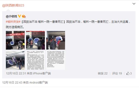 據(jù)新浪微博爆料:【因救治不當(dāng)榆林一院一患者死亡】因救治不當(dāng),榆林一院一患者死亡,主治大夫逃離,院方造假病歷。