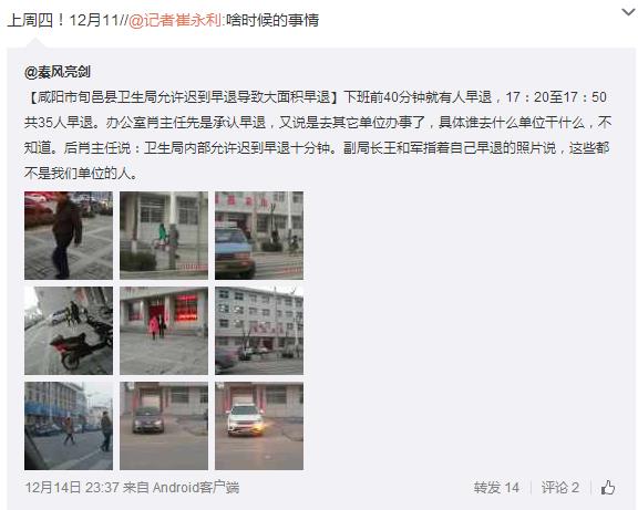 據(jù)新浪微博爆料:【咸陽市旬邑縣衛(wèi)生局允許遲到早退導(dǎo)致大面積早退】下班前40分鐘就有人早退,17:20至17:50共35人早退。辦公室肖主任先是承認(rèn)早退,又說是去其它單位辦事了,具體誰去什么單位干什么,不知道。后肖主任說:衛(wèi)生局內(nèi)部允許遲到早退十分鐘。副局長王和軍指著自己早退的照片說,這些都不是我們單位的人。