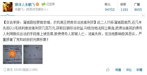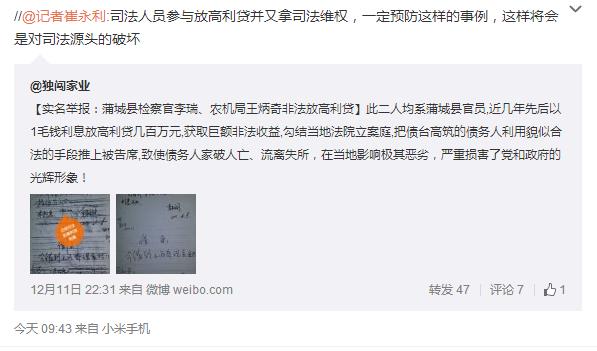 此二人均系蒲城縣官員,近幾年先后以1毛錢利息放高利貸幾百萬元,獲取巨額非法收益,勾結當?shù)胤ㄔ毫竿?把債臺高筑的債務人利用貌似合法的手段推上被告席,致使債務人家破人亡、流離失所,在當?shù)赜绊憳O其惡劣,嚴重損害了黨和政府的光輝形象!