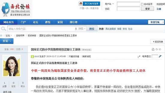 我們是6位堂堂正正的國家公辦“小學(xué)高級教師”,原屬于鐵道部一局四處,住址是在陜西省咸陽市。中鐵一局四處頂風(fēng)違紀(jì),不顧不管國家規(guī)定與人事紀(jì)律,視國務(wù)院和陜西省.政府的文件為“廢紙”,為騙取國家財政資金,硬是改變事實,弄虛作假,將我們強迫性按普通工人退休。而且十多年來拒不改正其錯誤,從而給我們造成了巨大的精神與財產(chǎn)損失,迫于無奈我們現(xiàn)在只好將事實真相公布于天下——