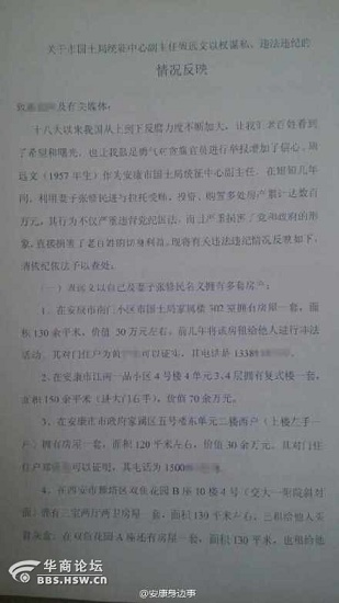 安康市國土局統(tǒng)征中心副主任周某,利用妻子張某進行拉托受賄,購置多處房產(chǎn)與高檔汽車。其中:安康房產(chǎn)三處,西安房產(chǎn)三處,高檔汽車兩輛。據(jù)稱,周某在工作期間,用職務(wù)之便與開發(fā)商達成協(xié)議,用串通,指定評估預(yù)算等方式,獲取巨額利益。其妻曾公開炫耀其夫權(quán)力與財富!