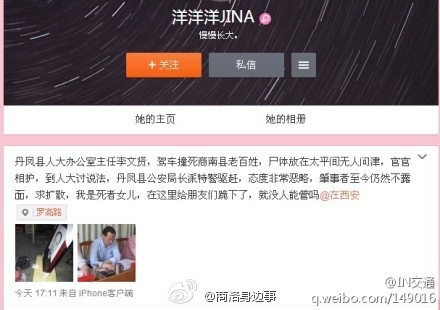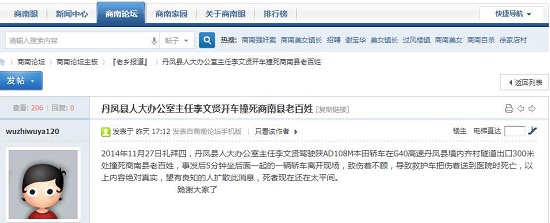 2014年11月27日禮拜四,丹鳳縣人大辦公室主任李文賢駕駛陜AD108M本田轎車在G40高速丹鳳縣境內(nèi)齊村隧道出口300米處撞死商南縣老百姓,事發(fā)后5分鐘坐后面一起的一輛轎車離開現(xiàn)場,致傷著不顧,導(dǎo)致救護(hù)車把傷著送到醫(yī)院時(shí)死亡,以上內(nèi)容絕對(duì)真實(shí),望有良知的人擴(kuò)散此消息,死者現(xiàn)在還在太平間。