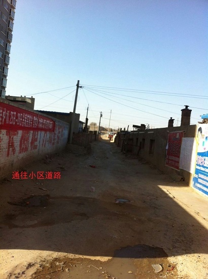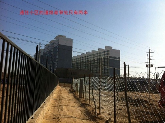 原教育局籌建領(lǐng)導(dǎo)小組承諾為小區(qū)北大門出口建成寬8米的一條能通往濱河路的東西走向道路,而自小區(qū)開工,到2014年11月底,現(xiàn)在的道路數(shù)次被當(dāng)?shù)卮迕窦芭R時彩鋼居住的民眾傾占,該道路現(xiàn)在窄處只有兩米,僅能單行通過一輛小車,且完成沒有硬化,一旦遇到雨天,泥濘不堪,小區(qū)住戶苦不堪言,實(shí)在沒有辦法就用建筑垃圾墊,高低不平,即使不下雨通行也非常困難。