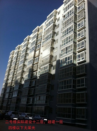 根據(jù)靖邊縣住建局審批,該工程共三棟樓,1號樓規(guī)劃審批為10層,2號、3號兩棟樓分別為11層,建筑面積為41500平米,總戶數(shù)為312戶。而現(xiàn)在的建設(shè)現(xiàn)狀為每棟樓分別違規(guī)加蓋一層,總戶數(shù)增加為342戶,據(jù)業(yè)主了解,建設(shè)部門不給予驗(yàn)收的其中一個原因就是因?yàn)樵摴こ踢`規(guī)超建。特別是1號樓加蓋一層后,導(dǎo)致2號、3號兩棟樓四樓以下采光受影響,尤其是一樓,每年11月中旬,已經(jīng)全天照不到太陽。小區(qū)業(yè)主與開發(fā)商詢問此事,開發(fā)商稱:“這是教育局要求的,我們在蓋樓前跟教育局簽了三方協(xié)議,協(xié)議就是1號樓為11層,2號、3號樓是12層,你們要問教育局?!?。而業(yè)主再與教育局有關(guān)領(lǐng)導(dǎo)詢問時一位領(lǐng)導(dǎo)稱:“當(dāng)時考慮教師多,就增加了樓層?!薄>褪沁@樣,教育局和開發(fā)商全然不顧住建局審批,公然每棟樓違規(guī)加蓋一層,造成工程超建的違法事實(shí),嚴(yán)重侵害了業(yè)主的合法權(quán)益。2號、3號樓一層、二層業(yè)主要求退房并賠償損失。