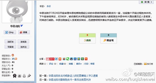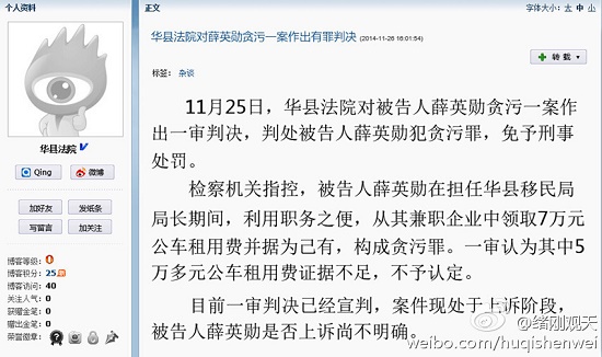 這是華縣法院通過官方新浪向社會公布的消息: