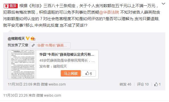 根據《刑法》三百八十三條規(guī)定,關于個人貪污數額在五千元以上不滿一萬元,犯罪后有悔改表現,積極退贓的可以免予刑事處罰。"考慮到被告人薛英勛已經退賠全部違法所得,根據本案事實、情節(jié)及社會危害程度,依法做出有罪判決,免予刑事處罰。"質疑@華縣法院不知對被告人薛英勛貪污數額是如何認定的?對社會危害程度不知是如何評估的?是否可以理解為,貪污只要退賠,就平安無事?那么,中央照此反腐,豈不成了笑話!?