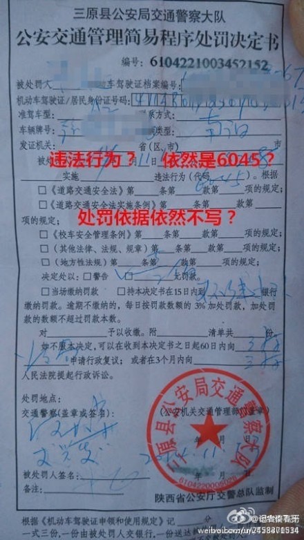 有網(wǎng)友實(shí)名舉報(bào):貨車正常途經(jīng)三原縣境內(nèi)時(shí),不說明原因便處罰,交警為提高罰款效率違法行為和處罰依據(jù)均不填寫,最多的使用“6045”!網(wǎng)友質(zhì)疑三原縣交警上路執(zhí)法到底是為管理還是為罰款?請@陜西交警@咸陽交警官方微博調(diào)查事實(shí)真相并公布處理結(jié)果!