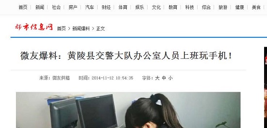 12日,有微友在微信平臺發(fā)來黃陵縣交警大隊辦公室人員上班玩手機的照片。