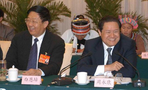2004年3月,周永康到全國(guó)人大云南代表團(tuán)參加審議,原云南省委書記白恩培在會(huì)上。中新社 發(fā) 季肖虹 攝