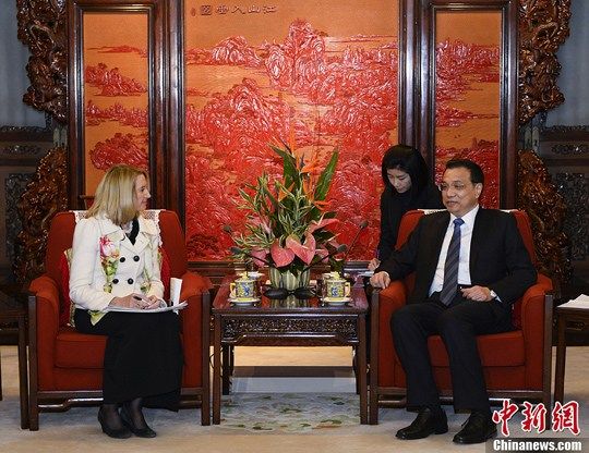 2014年1月13日,中國(guó)國(guó)務(wù)院總理李克強(qiáng)在北京中南海紫光閣會(huì)見了美國(guó)《科學(xué)》雜志主編瑪西婭·納特一行。(資料圖)中新社發(fā) 劉震 攝