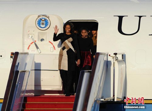 圖為3月20日,美國總統(tǒng)奧巴馬的夫人米歇爾·奧巴馬乘專機抵達北京,開始對中國的訪問。侯宇 攝