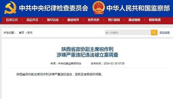 中新網(wǎng)2月19日電據(jù)中央紀(jì)委監(jiān)察部網(wǎng)站消息,陜西省政協(xié)副主席祝作利涉嫌嚴(yán)重違紀(jì)違法,目前正接受組織調(diào)查。