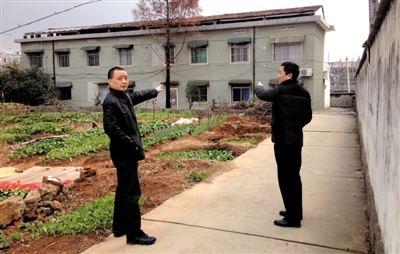 12月18日,被停職半月的陳龍(左)指著自己家所在的兩層建筑。