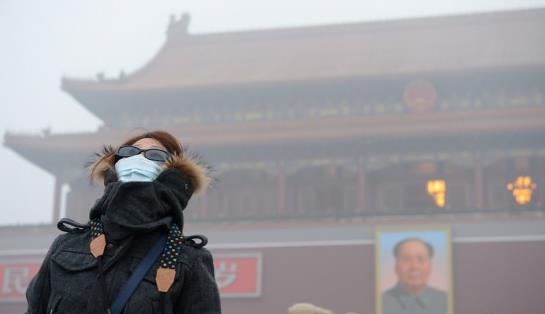 1月29日,一名游客在北京天安門城樓前。當(dāng)日北京霧霾天持續(xù),空氣嚴(yán)重污染。(資料圖)