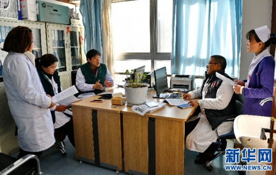 25日,在西藏自治區(qū)人民醫(yī)院門診部辦公室,醫(yī)院信息處處長(zhǎng)、北京大學(xué)第一醫(yī)院醫(yī)療援藏專家章磊(左三)和門診部主任旺加(右二)等醫(yī)務(wù)工作者商討如何做好114預(yù)約掛號(hào)診療服務(wù)相關(guān)事宜。