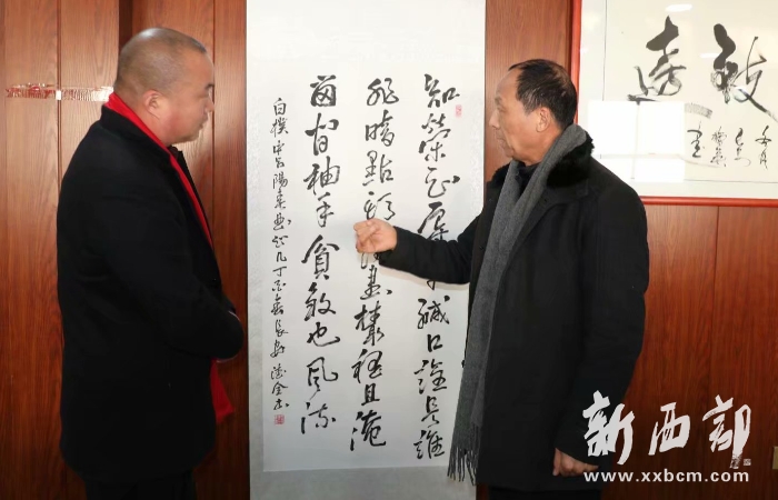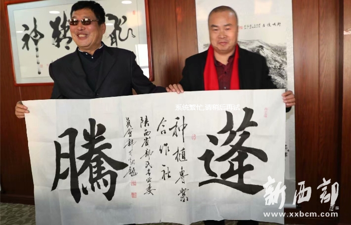 郭氏專業(yè)委員副會長、西安郭氏書畫院院長郭德全(右)向陜西蓬騰農(nóng)產(chǎn)品有限公司總經(jīng)理郭小鵬贈送墨寶