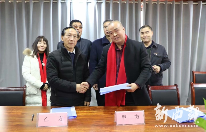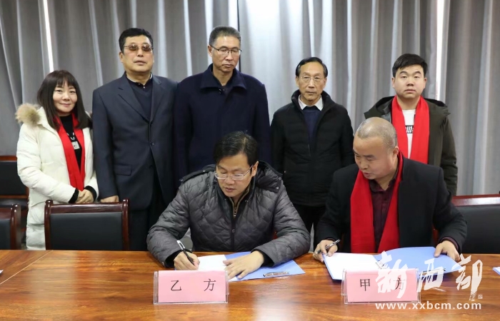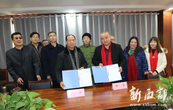 郭氏專業(yè)委員副會長、西安郭氏書畫院院長郭德全(前左)與陜西蓬騰農(nóng)產(chǎn)品有限公司總經(jīng)理郭小鵬雙方就合作建立書畫工作室舉行簽約儀式