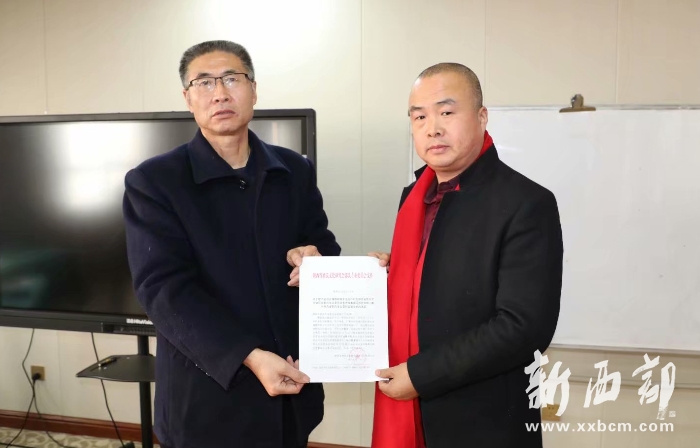 郭氏專業(yè)委員會會長郭興前(左)向陜西蓬騰農(nóng)產(chǎn)品有限公司總經(jīng)理郭小鵬頒發(fā)文件