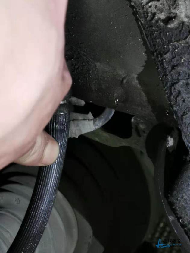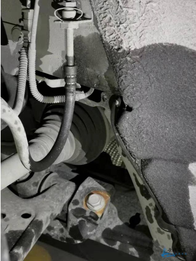 于是,他叫來做他車輛保養(yǎng)的專業(yè)師傅(非4S店)仔細(xì)檢查后,發(fā)現(xiàn)是右前側(cè)制動(dòng)器軟管爆裂,剎車液已噴滿整個(gè)輪胎內(nèi)側(cè)和擋泥板,并已漏的干干凈凈,完全沒有了制動(dòng)。