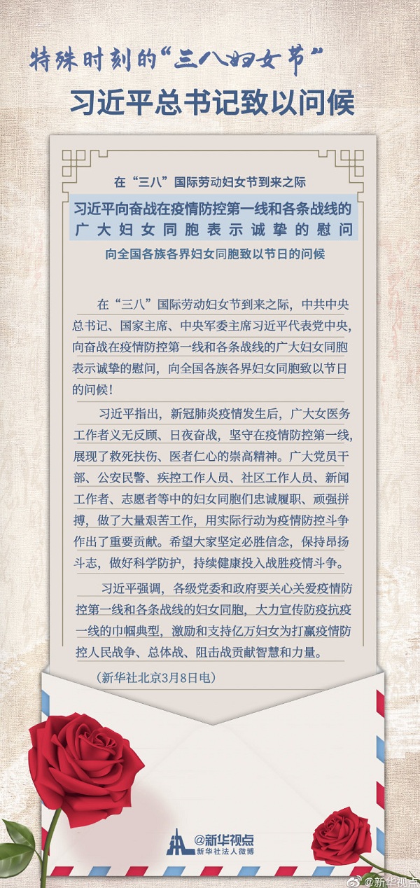 習(xí)近平強(qiáng)調(diào),各級(jí)黨委和政府要關(guān)心關(guān)愛疫情防控第一線和各條戰(zhàn)線的婦女同胞,大力宣傳防疫抗疫一線的巾幗典型,激勵(lì)和支持億萬婦女為打贏疫情防控人民戰(zhàn)爭(zhēng)、總體戰(zhàn)、阻擊戰(zhàn)貢獻(xiàn)智慧和力量。