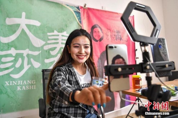 4月16日,新疆喀什地區(qū)莎車縣電子商務(wù)公共服務(wù)中心,本地“網(wǎng)紅”阿斯達(dá)木·克依木通過直播,向全國各地的網(wǎng)民推銷家鄉(xiāng)特色農(nóng)產(chǎn)品。中新社記者 劉新 攝