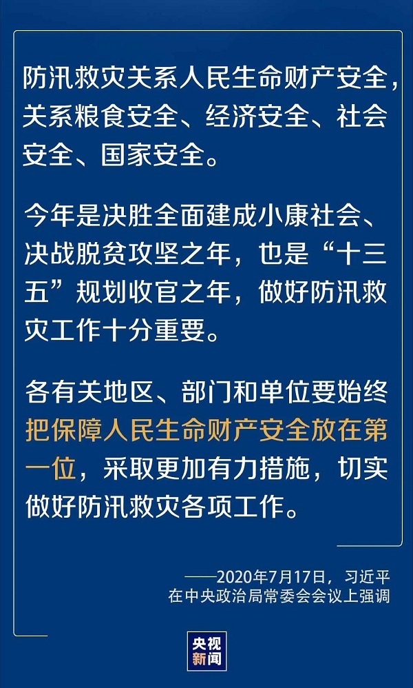 習(xí)近平要求,各地區(qū)和有關(guān)部門要堅持人民至上、生命至上,統(tǒng)籌做好疫情防控和防汛救災(zāi)工作,堅決落實責(zé)任制,堅持預(yù)防預(yù)備和應(yīng)急處突相結(jié)合,加強(qiáng)汛情監(jiān)測,及時排查風(fēng)險隱患,有力組織搶險救災(zāi),妥善安置受災(zāi)群眾,維護(hù)好生產(chǎn)生活秩序,切實把確保人民生命安全放在第一位落到實處。
