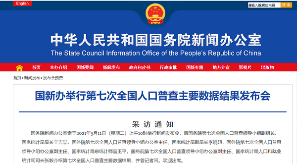 國新辦將舉行第七次全國人口普查主要數(shù)據(jù)結果發(fā)布會