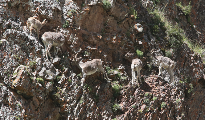 巖羊的保護(hù)色很有效,如果不仔細(xì)看,很容易在巖石峭壁之間與它們錯(cuò)過(guò),拍攝于昂賽大峽谷。澎湃新聞?dòng)浾?孫鵬程 圖。
