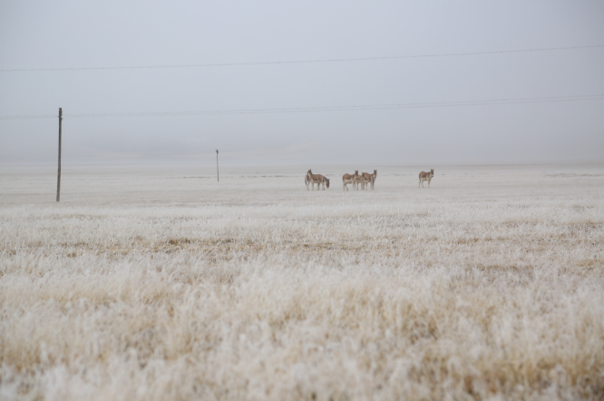 從瑪多縣城前往牛頭碑的路上,幾只藏野驢正在路邊悠閑地吃草。今年5月,當(dāng)?shù)亻_始禁止游客進(jìn)入,為避免繼續(xù)破壞野生動(dòng)物的棲息地。澎湃新聞?dòng)浾?孫鵬程 圖。